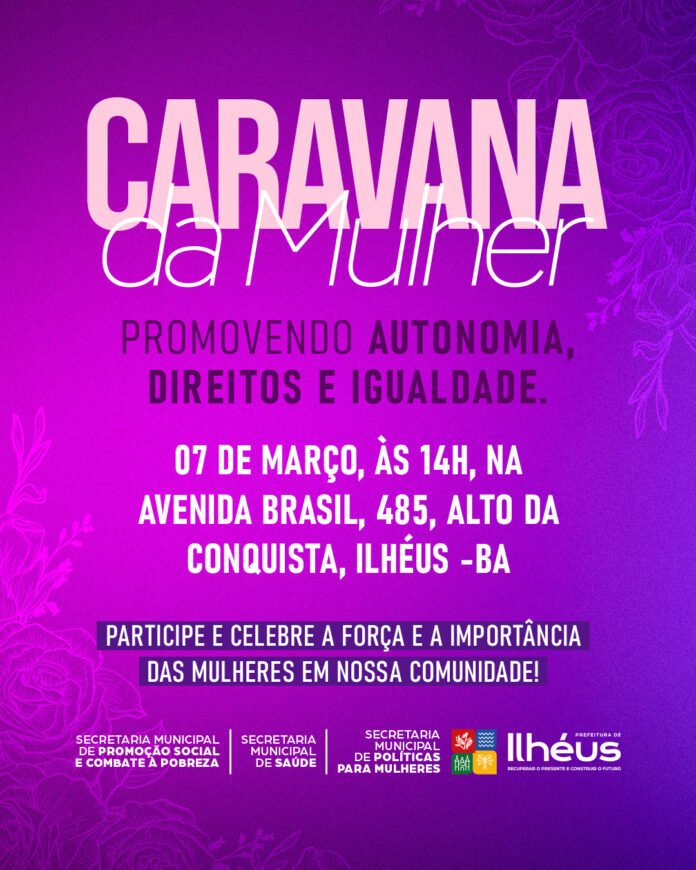 A Prefeitura de Ilhéus realiza no próximo dia 7 de março mais uma edição da Caravana da Mulher, desta vez no bairro Conquista, reforçando a programação especial do Mês da Mulher. A ação acontece às 14h, na Avenida Brasil, nº 485, e integra esforços da Secretaria de Políticas para as Mulheres, da Secretaria de Promoção Social e Combate à Pobreza e da Secretaria de Saúde. O foco é claro: ampliar o acesso a serviços públicos essenciais, diretamente nas comunidades. 🌷