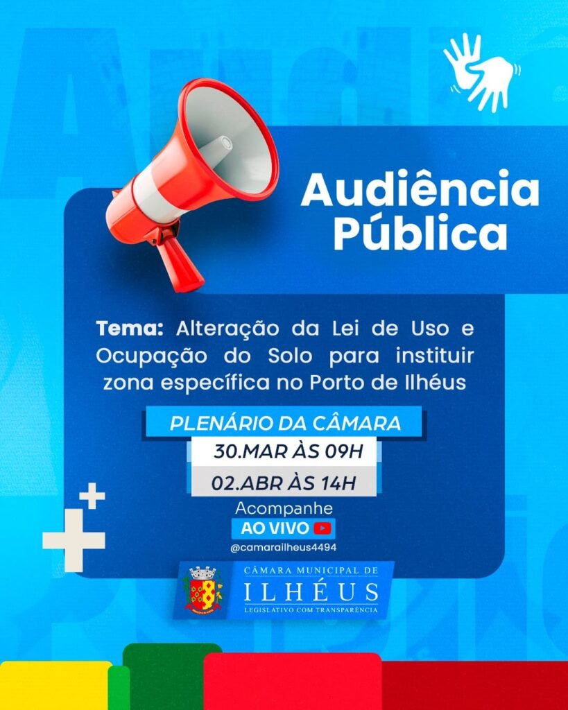 A Câmara Municipal de Ilhéus (CMI) vai promover, na semana que vem, duas audiências públicas para debater o Projeto de Lei (PL) 69/2025, que busca promover uma alteração na Lei Municipal nº 3.746/2015, de uso e ocupação do solo no município. O objetivo é discutir a instituição de uma zona específica para a área do Moinho de Trigo do Porto.